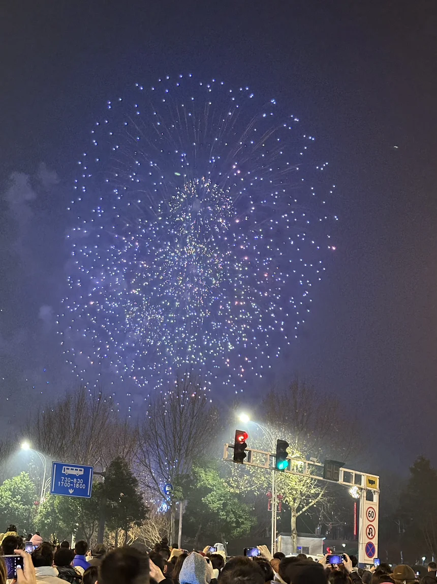 夜色慢慢降临,浪漫才刚刚开始。街道夜空之上绽放绚烂的蓝色烟花,氛围感直接拉满。