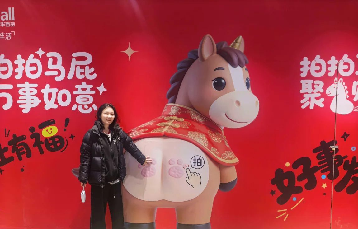 逛商场遇到的「拍拍马屁 万事如意」打卡装置,红红火火超喜庆,拍一拍马屁股,新的一年万事顺意;