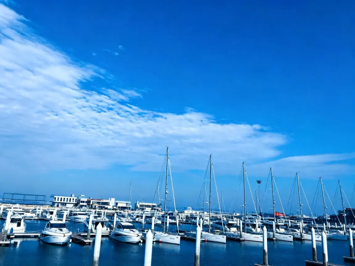 图7️⃣是大连东港游艇码头,白色的游艇与帆船⛵⛵,桅杆林立,排列有序,澄澈的湛蓝色天空,舒展的白色云朵,十分的干净清爽。