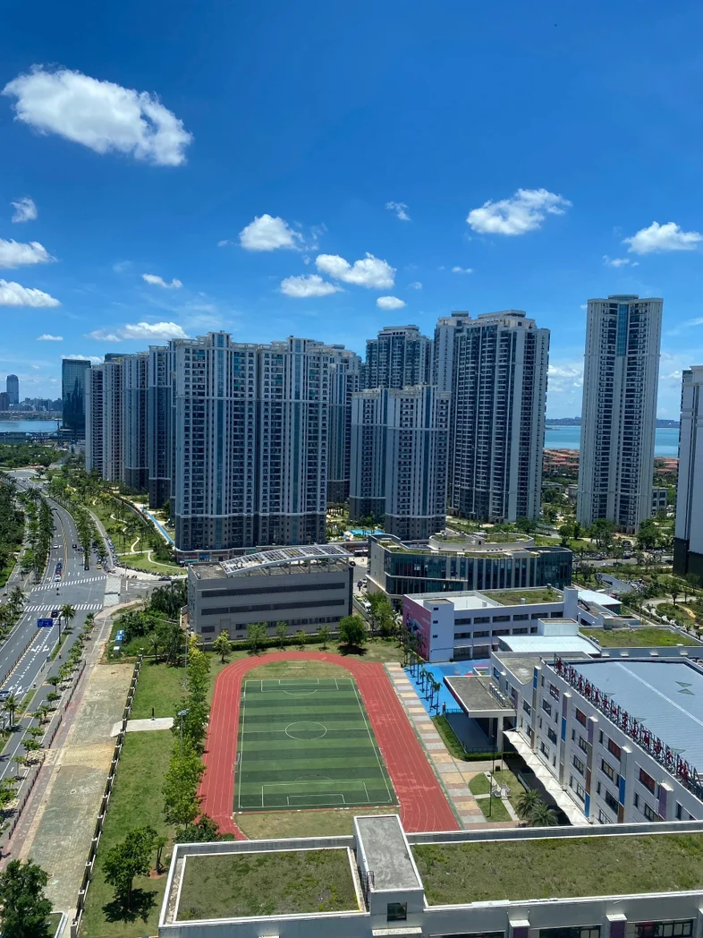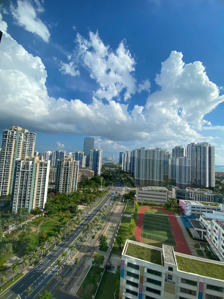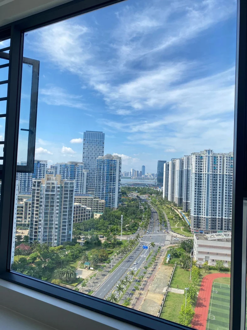 午后时光,阳光变得柔和,大朵的云絮在蓝天里慢悠悠游走,时而遮住阳光,在地面投下细碎的光影;楼下的小径上,有邻里悠闲散步,孩童嬉笑打闹,道路上车流缓缓穿梭,与远处的景致相映成趣,构成一幅鲜活的生活画卷。傍晚时分,晚霞晕染天际,从橘红渐变为粉紫,车流化作流动的光河,把整个窗外都衬得温柔又浪漫。