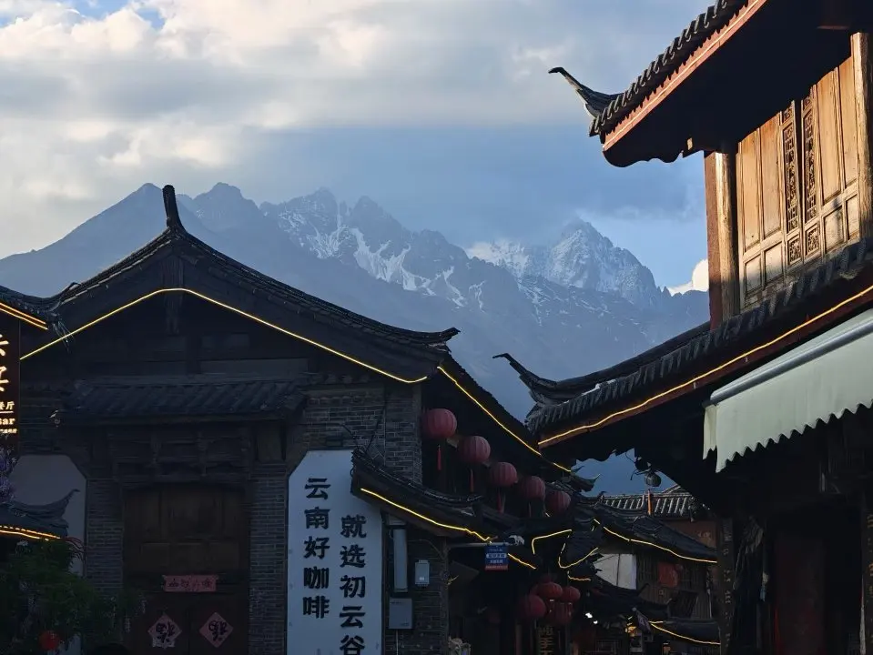 在初云谷咖啡的门口,拍下了古镇街巷与雪山的经典画面,傍晚的暖光串灯亮起,红灯笼在风里轻轻晃,远处雪山被夕阳染成淡金色,氛围感直接拉满。古镇里没有熙熙攘攘的游客,只有慢悠悠的纳西老人、卖手工银饰的小店,还有抬头就能看见的雪山,随便找个角落坐一下午,喝杯云南咖啡,所有的疲惫都被治愈了。