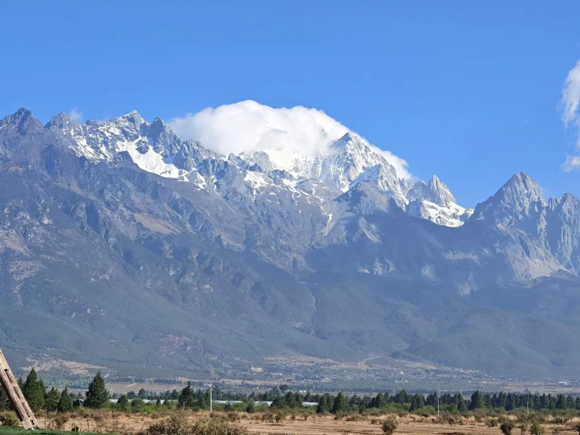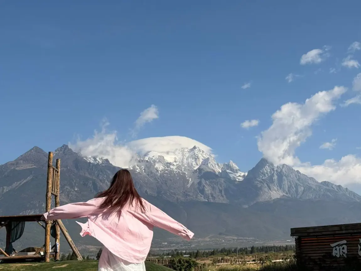 这次最幸运的,就是在丽江的晴天里,看清了玉龙雪山的全貌。站在古镇外的草坪上,雪山就在眼前,云顶被阳光照得发亮,像是给雪山戴上了一顶白帽子。张开手臂拥抱雪山的瞬间,风从耳边吹过,远处的雪山在蓝天里闪着光,那一刻真的觉得所有的奔波都值得了。