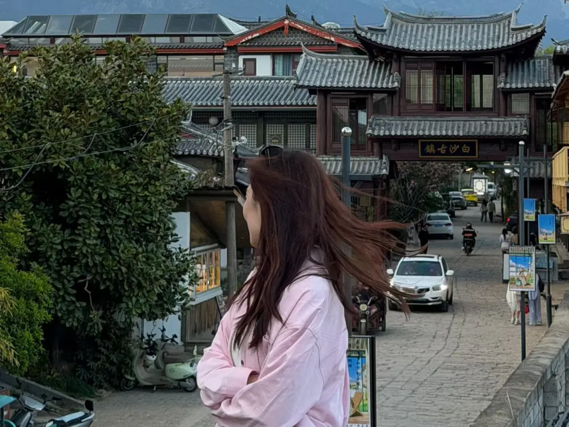2. 穿搭建议:古镇+雪山的场景,浅色系、温柔风的衣服最出片,粉色衬衫+牛仔裤就很适配,既能拍出古镇的文艺感,也能和雪山的清冷感呼应。
