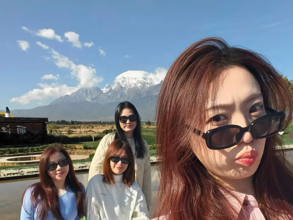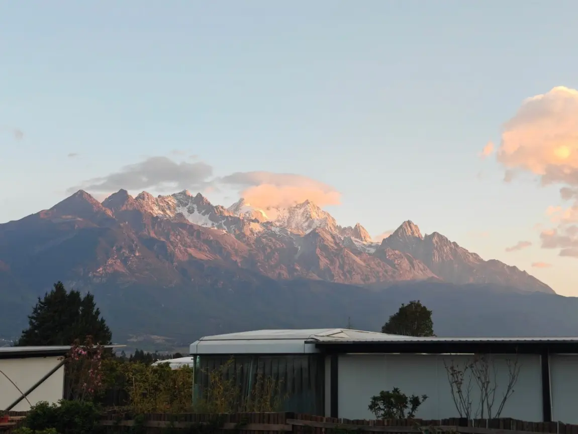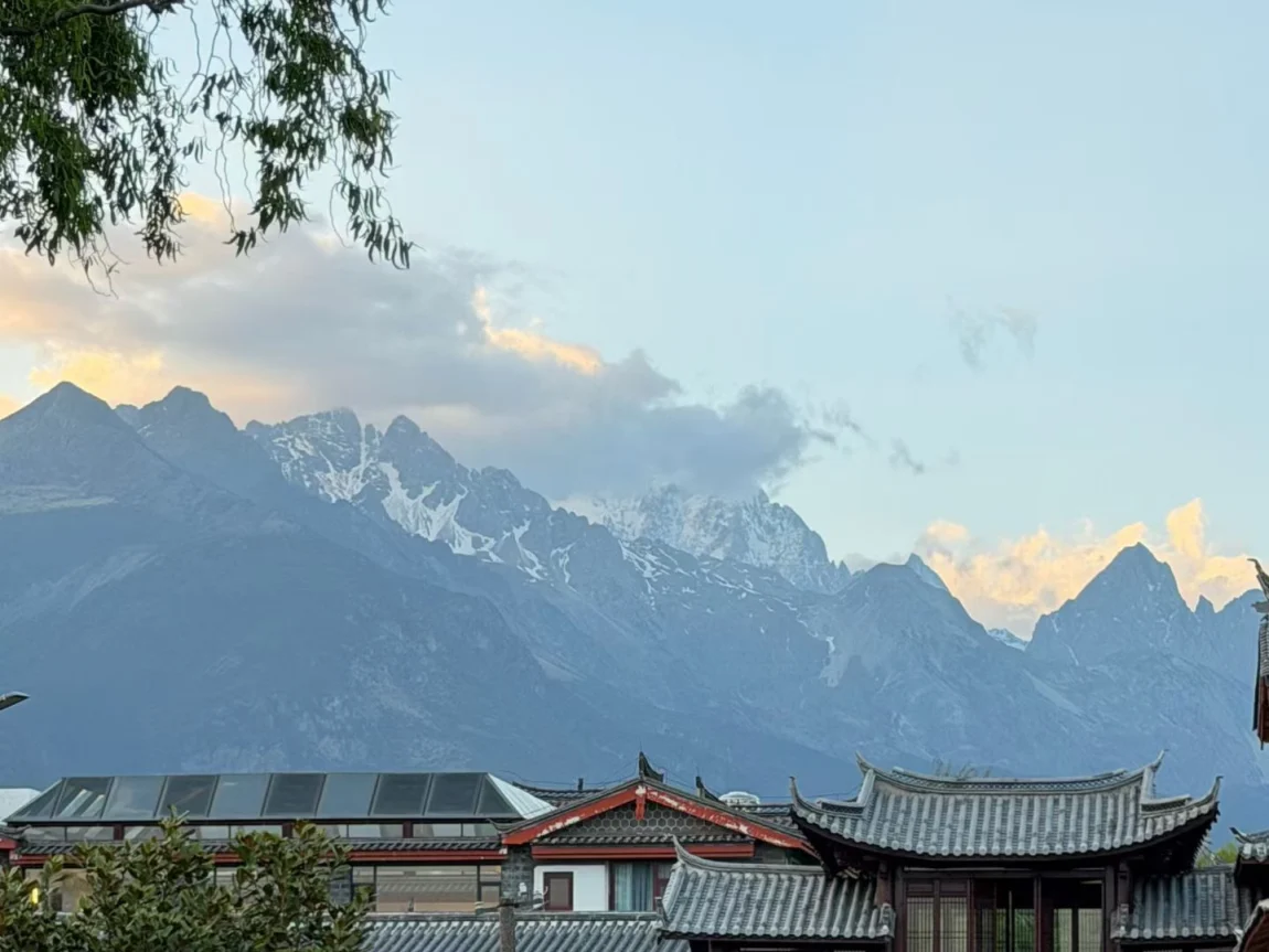 傍晚的时候,雪山被夕阳染成暖橙色,日照金山的余晖洒在古镇的屋顶上,连空气里都带着温柔的味道。和闺蜜们在雪山前拍了合照,墨镜、笑脸、还有远处的雪山,这大概就是旅行最美好的样子。