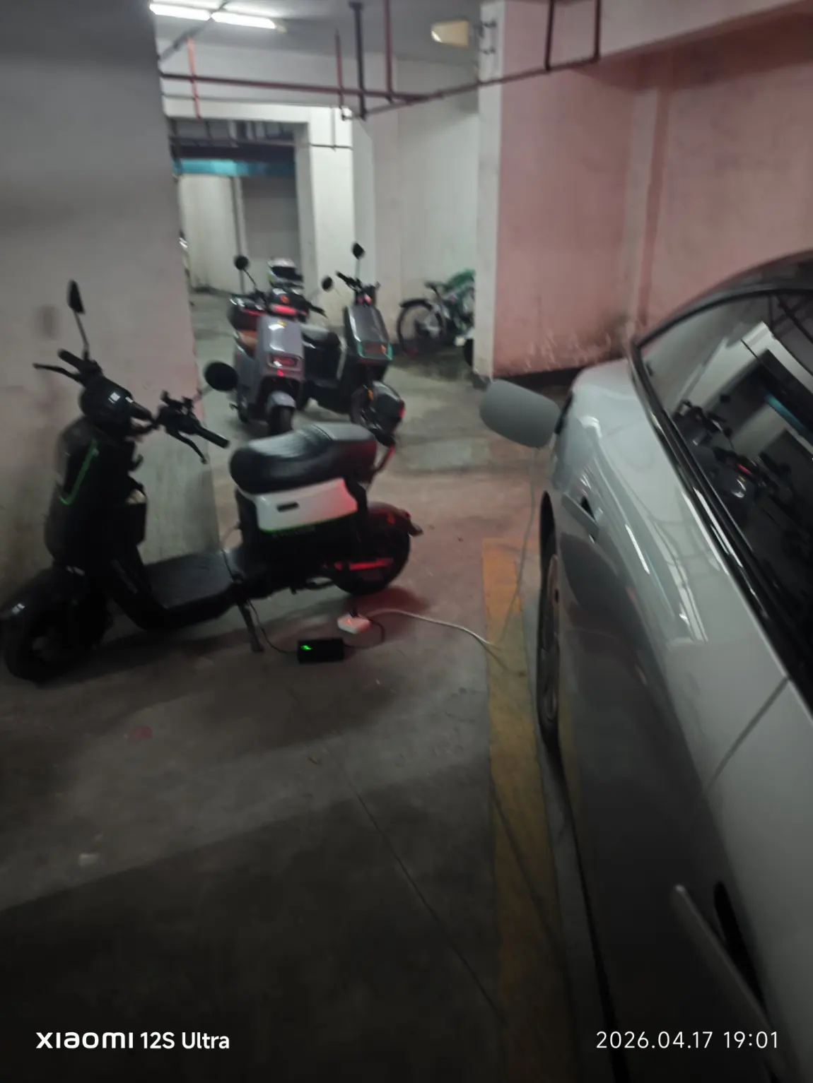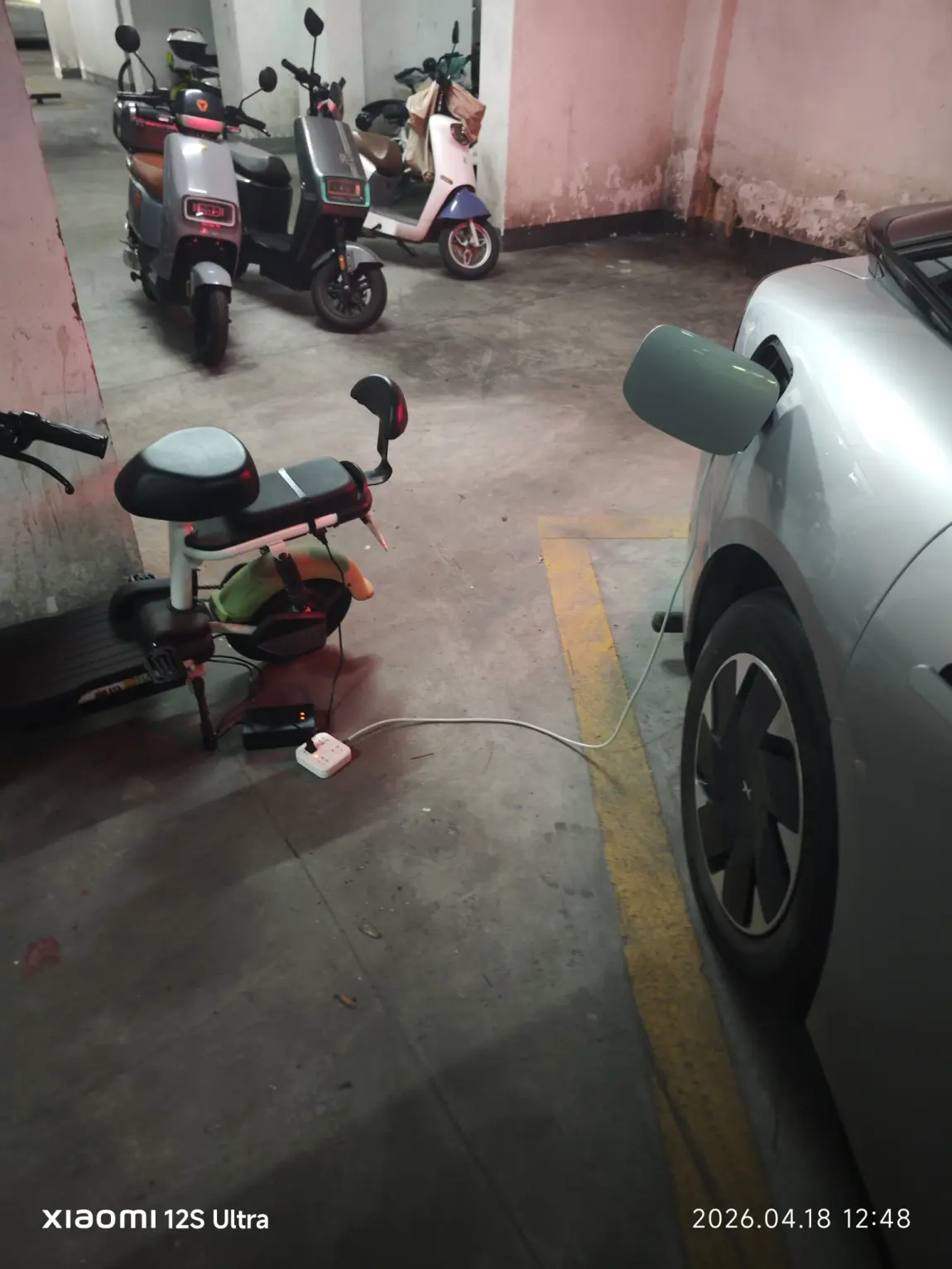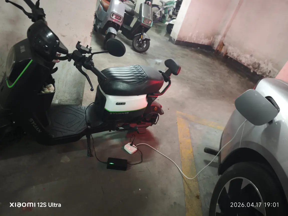 新功能,新技巧,两台电动车就放在车位旁边放电,然后不用出去充电了