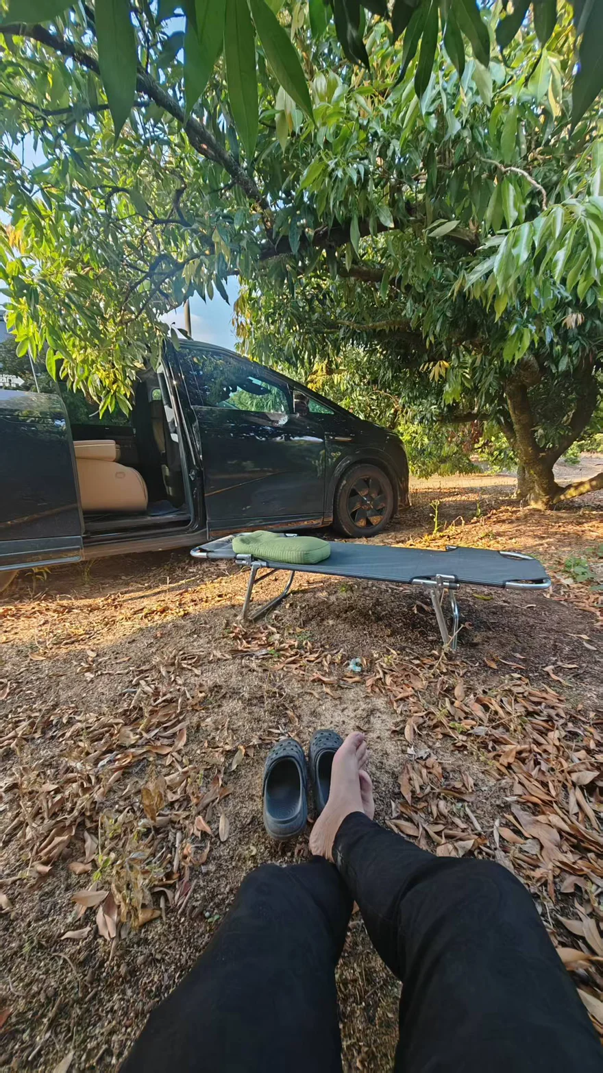 不用赶时间,不用找热门景点,开到郊外的荔枝林里,打开车门就是一片阴凉。把折叠床支在树下,脚边是落叶,耳边是风声,车里是随手就能拿到的水和零食。