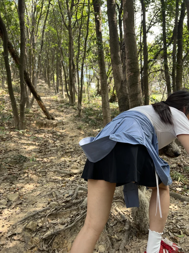 趁着好天气,和她一起走进户外森林,身边还跟着两只毛孩子。