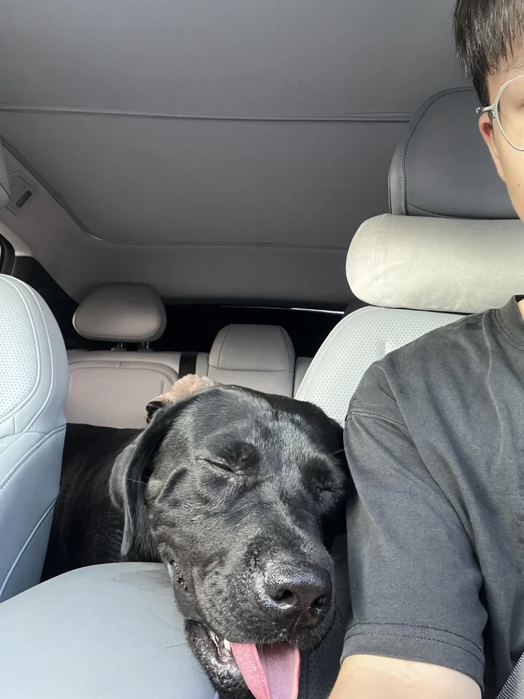 我们家俩毛孩子——拉拉和扯扯,一上车就兴奋!车内空间够大,它们能自在走动,第三排放倒后,直接变成狗狗的专属小天地。
