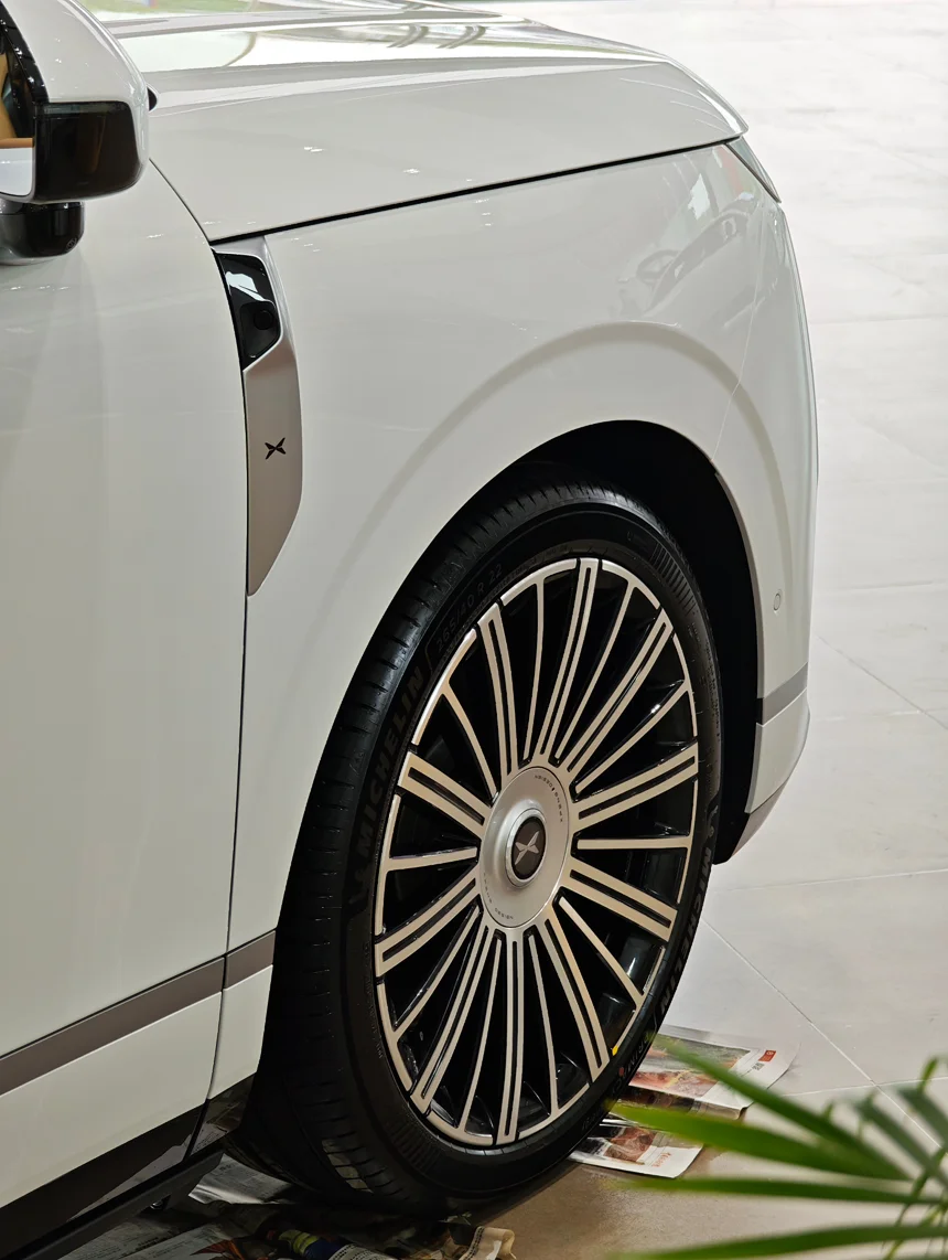 展厅中间那台珠峰白GX,灯光一打,又大又亮,气场直接拉满。绕到侧面一看轮毂——22寸的大脚,前轮宽度有265,后轮更夸张,直接干到285!销售说这是米其林刚出的PS5E轮胎,专门给这种大块头用的,看着就稳。还有车头那个DLP投影大灯,能往地上打动画,跟拍电影似的,晚上接孩子应该挺好玩😂