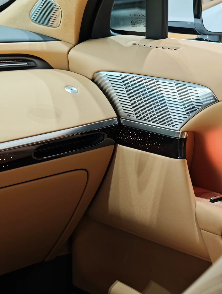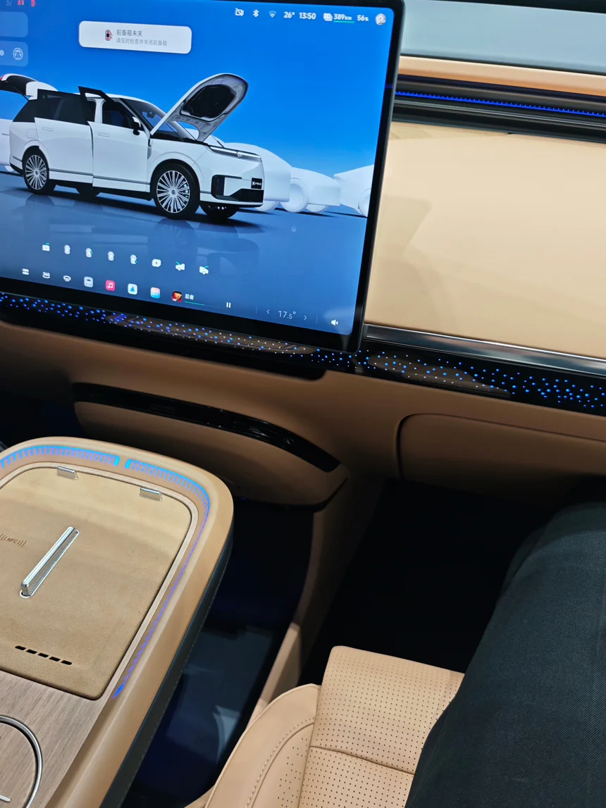 拉开门,铂金棕色的内饰看着就很贵气,摸哪哪软。中控大屏流畅得跟pad一样,中间那个无线充电板还会升降,手机放上去氛围灯就亮,科技感拿捏得死死的👍