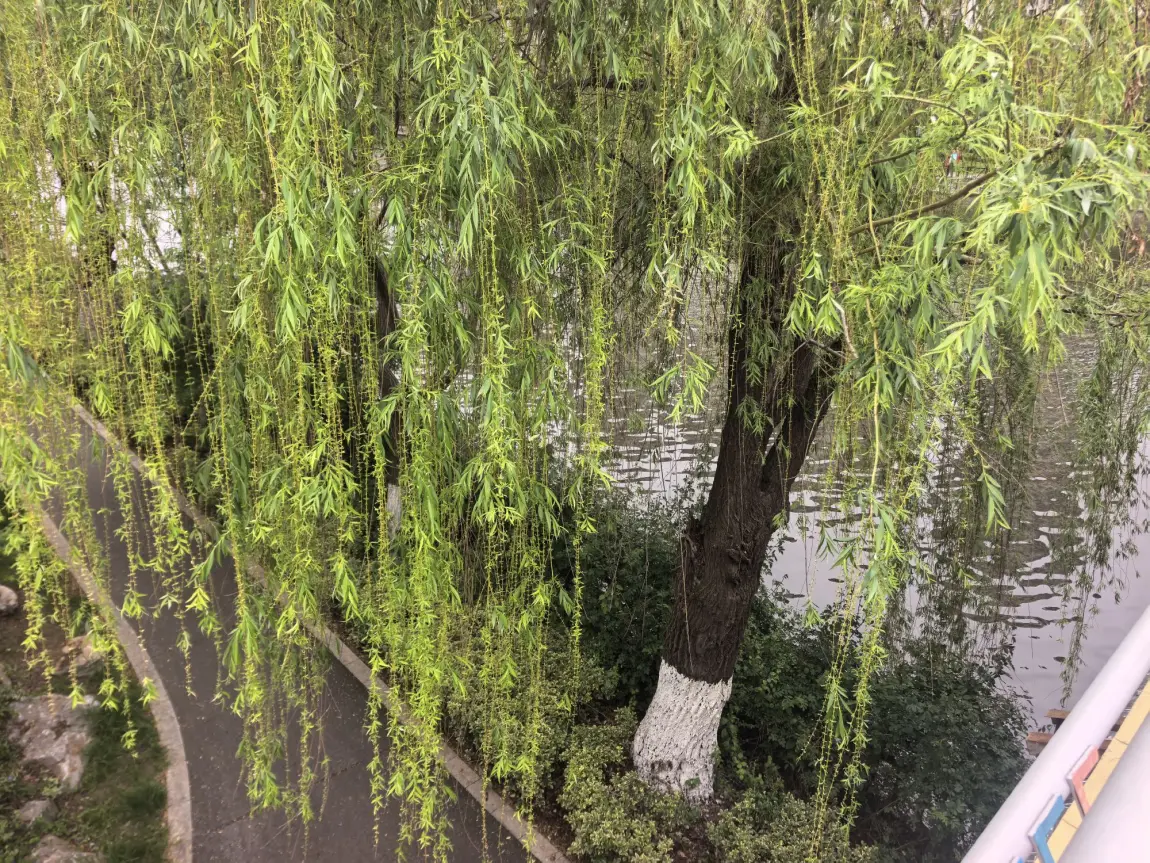 水域边上多是垂柳,厚厚的树皮龟裂枯化,与垂下的绿丝绦形成反差极大的冲突感。水域边上还有自然迸发而来的芦苇、灌木,浸泡水里,清除水内杂质,一片清清亮亮相间的互补之美!