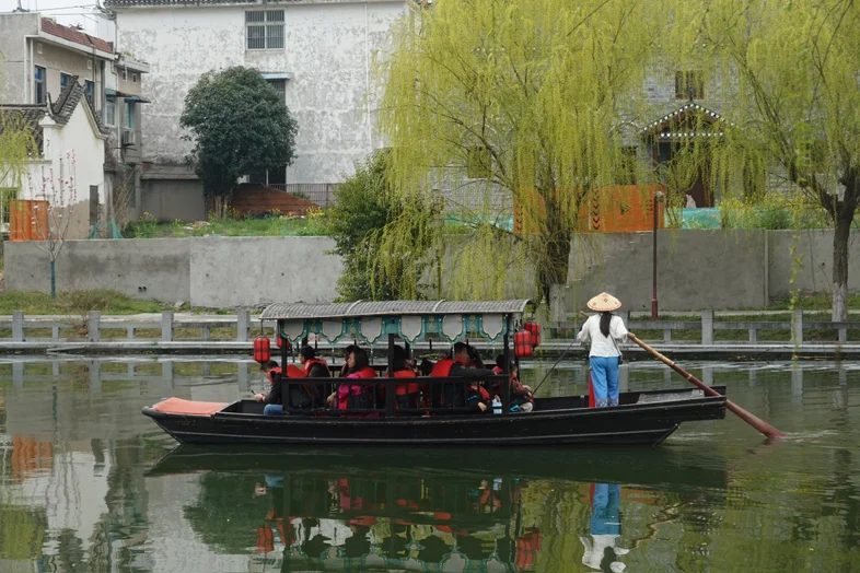 坐了慢悠悠的乌篷船,船桨轻轻划开水面,两岸的柳树都抽出了嫩黄的新芽,垂下来的枝条扫过水面,荡开一圈圈温柔的涟漪。河水清得像块被打磨过的碧玉,风一吹,带着水汽的草木香就裹了过来,连空气里都飘着青草和泥土的味道,深吸一口,全是春天的气息。