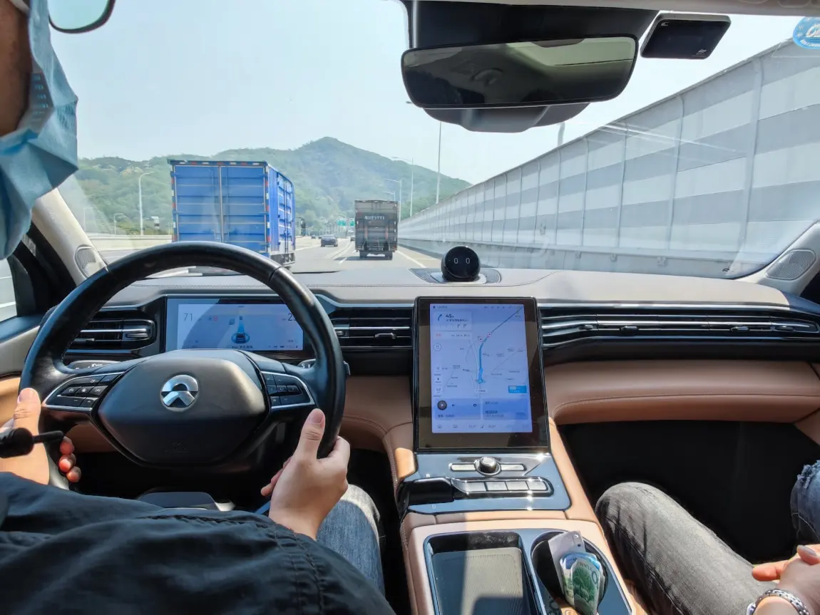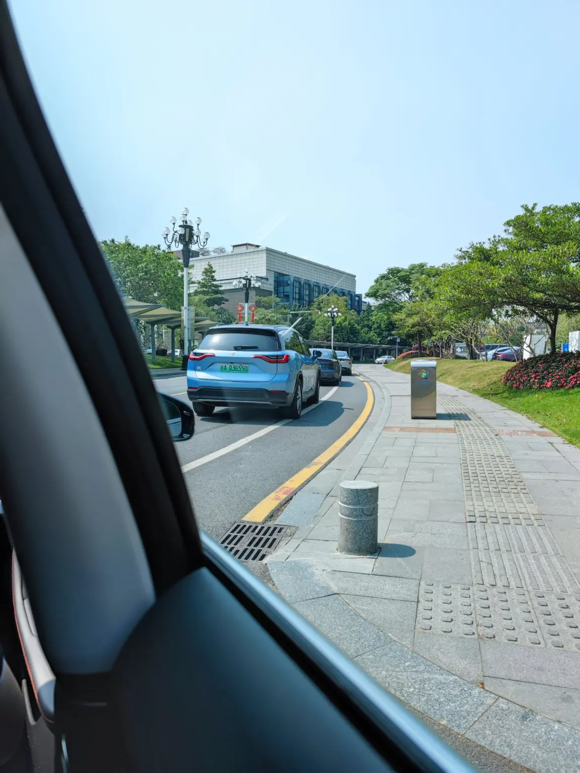 另一位男生开的,NOP开启后坐后排也没特别的感受,感觉就是像个年纪比较老的人在开车,虽然慢,但是也还算安全平稳,体验的路段也比较简单,匝道能顺利切换。有几个变道提示手动变道,有一个细节,蔚来的NOA手动转方向盘变道之后,NOA并不会退出,如果是p7手动变道,NGP就退出了,需要自己再拨杆重新进入。
