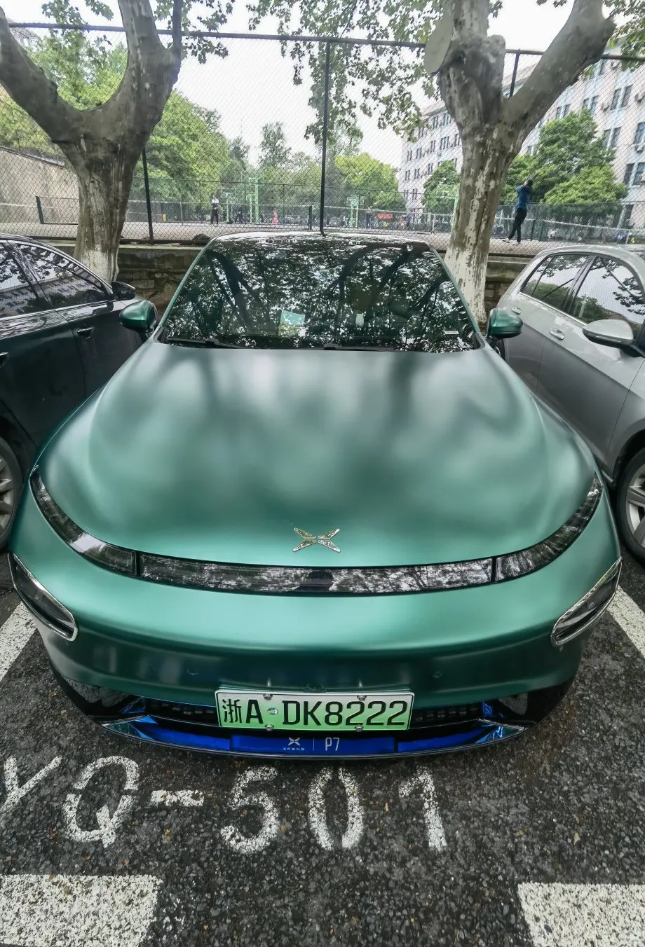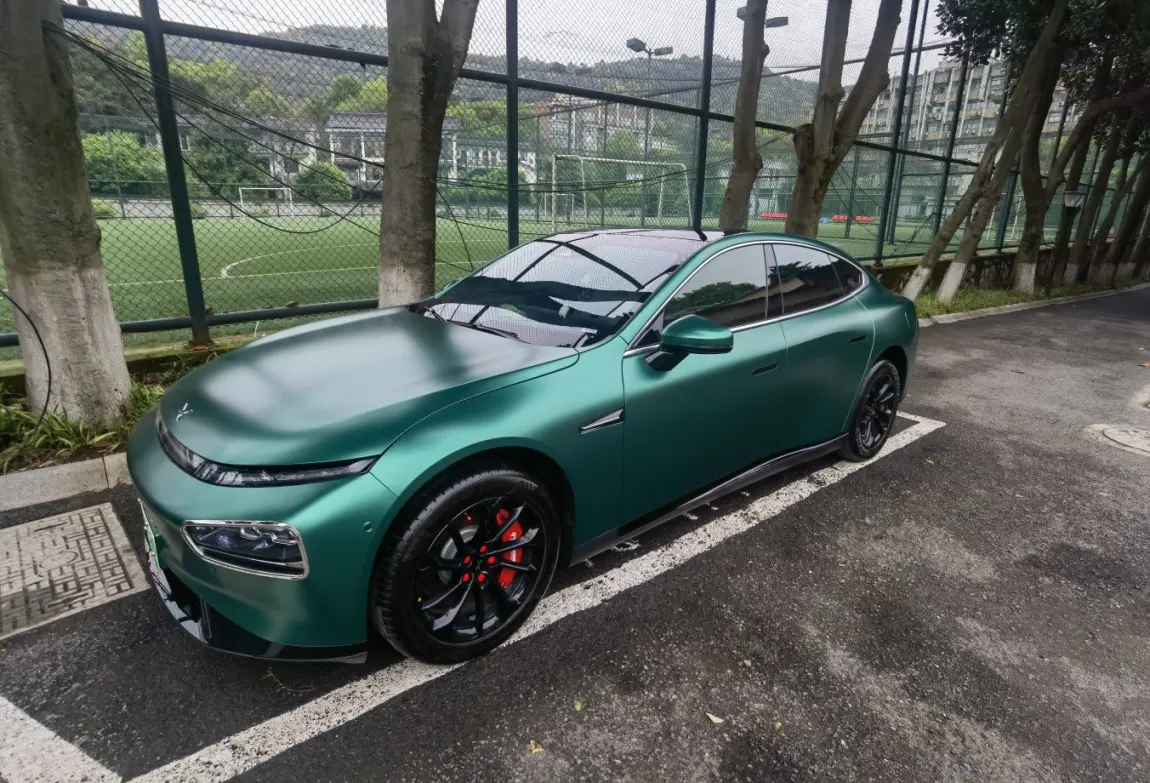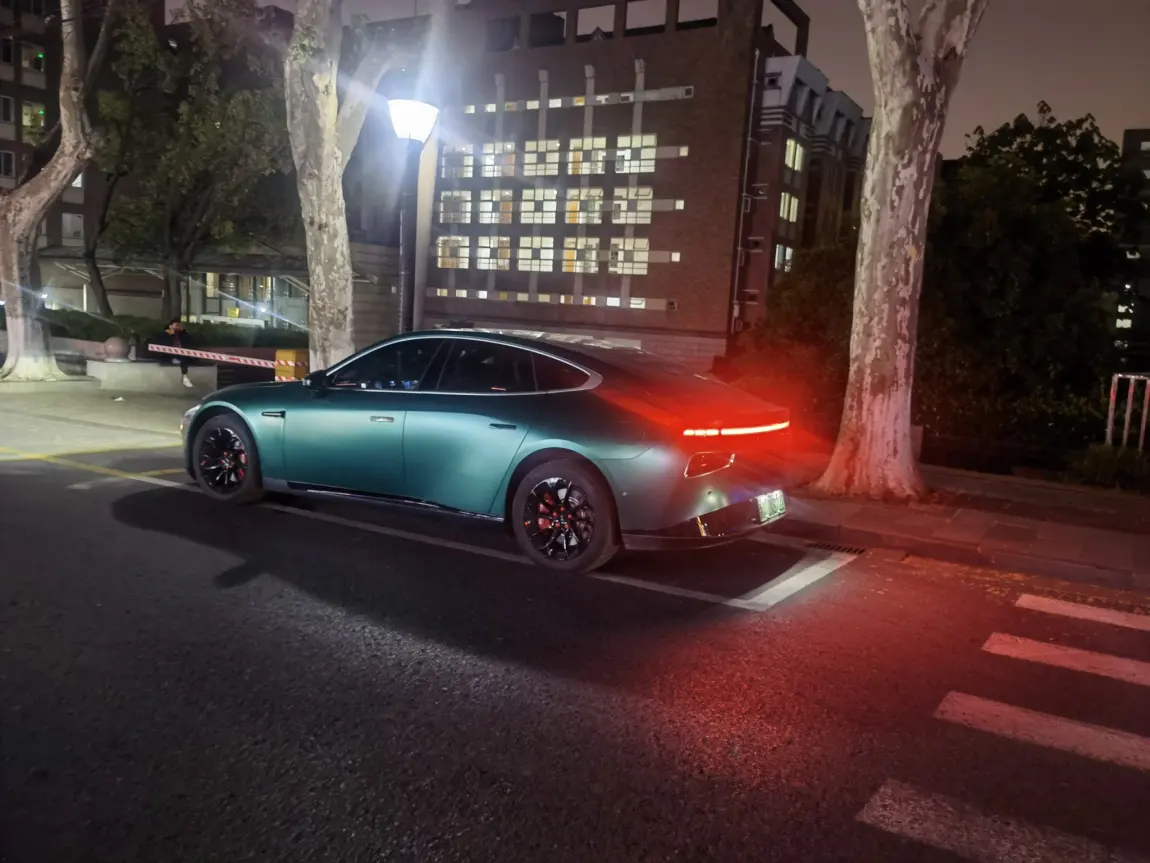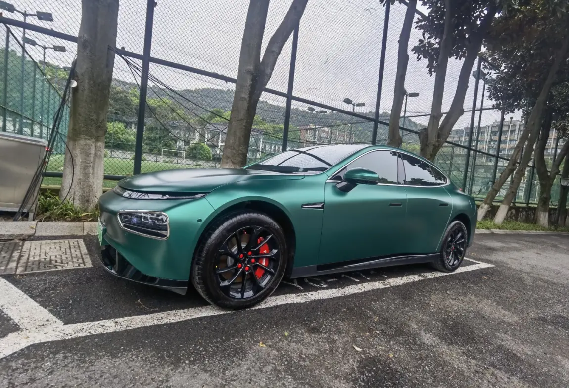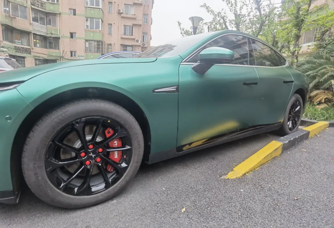贴了AX电光金属祖母绿改色膜+轮毂贴黑+门把贴黑+红色卡钳罩+前后大灯饰框+前杠饰条,晚上侧面太好看了