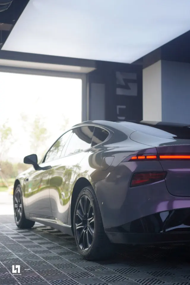 提车一个月,第一件事就是选择改色膜。纠结了很多颜色后,定下了星光魅影。深灰色为主色,不同角度透出紫色,整体的高级感上升了。19色双拼轮毂喷成哑黑,让小P凸显了更强的战斗范。