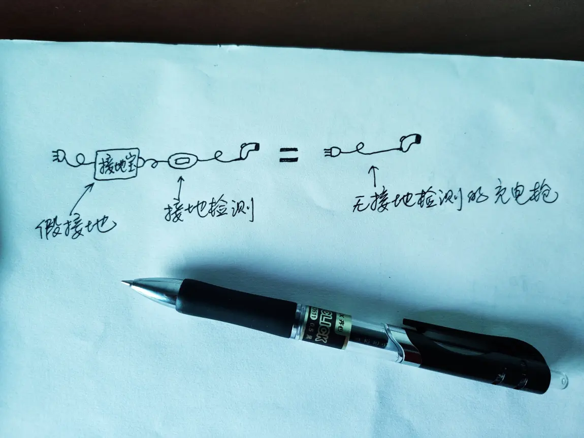 图2中的那个盒子的功能之一,是带有接地检测,其原理就是检测地线的电阻来检测是否是通路。电阻如果是无穷大的,为断路,就是未接地。如果电阻小于等于4Ω(这是国标,检测有一定宽容度),就认为是通路,接地了。接地宝给了地线一个通路,让接地检测以为你接地了。。。。但是这个通路不是从地线到大地的通路。。请看最后一张图!!!!