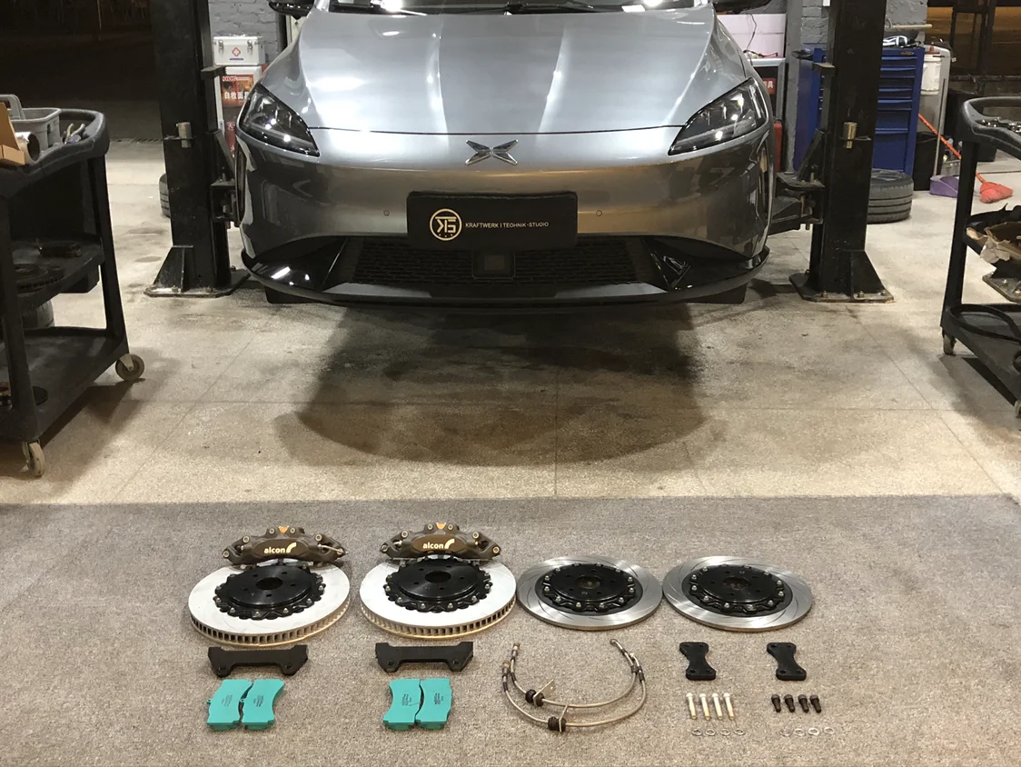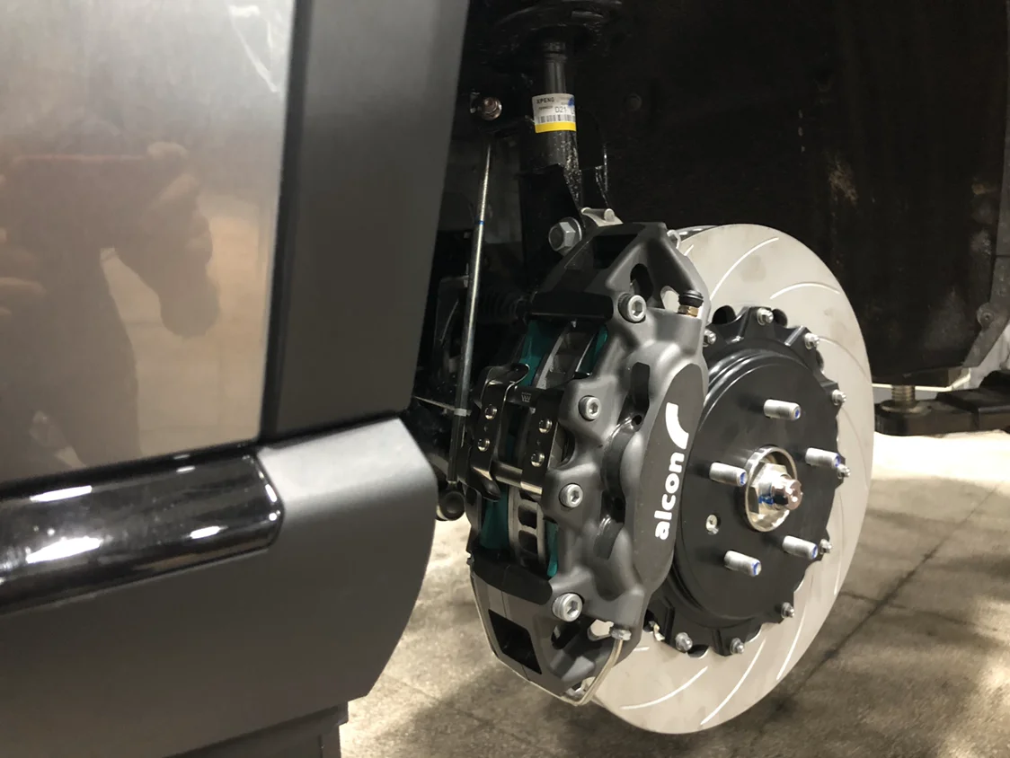 当时参考了很多数据,电动车最关心的就是能耗消耗,所以选用了英国的alcon这牌子。之前其中一辆跑赛道的厂车用了,觉得特别好。当是一也考虑过用ap的9660,但是卡钳对与G3来说会太重,所以选用目前市面上最轻的alcon car89型号。属于锻造卡钳,鹏友们感兴趣就自己百度吧。