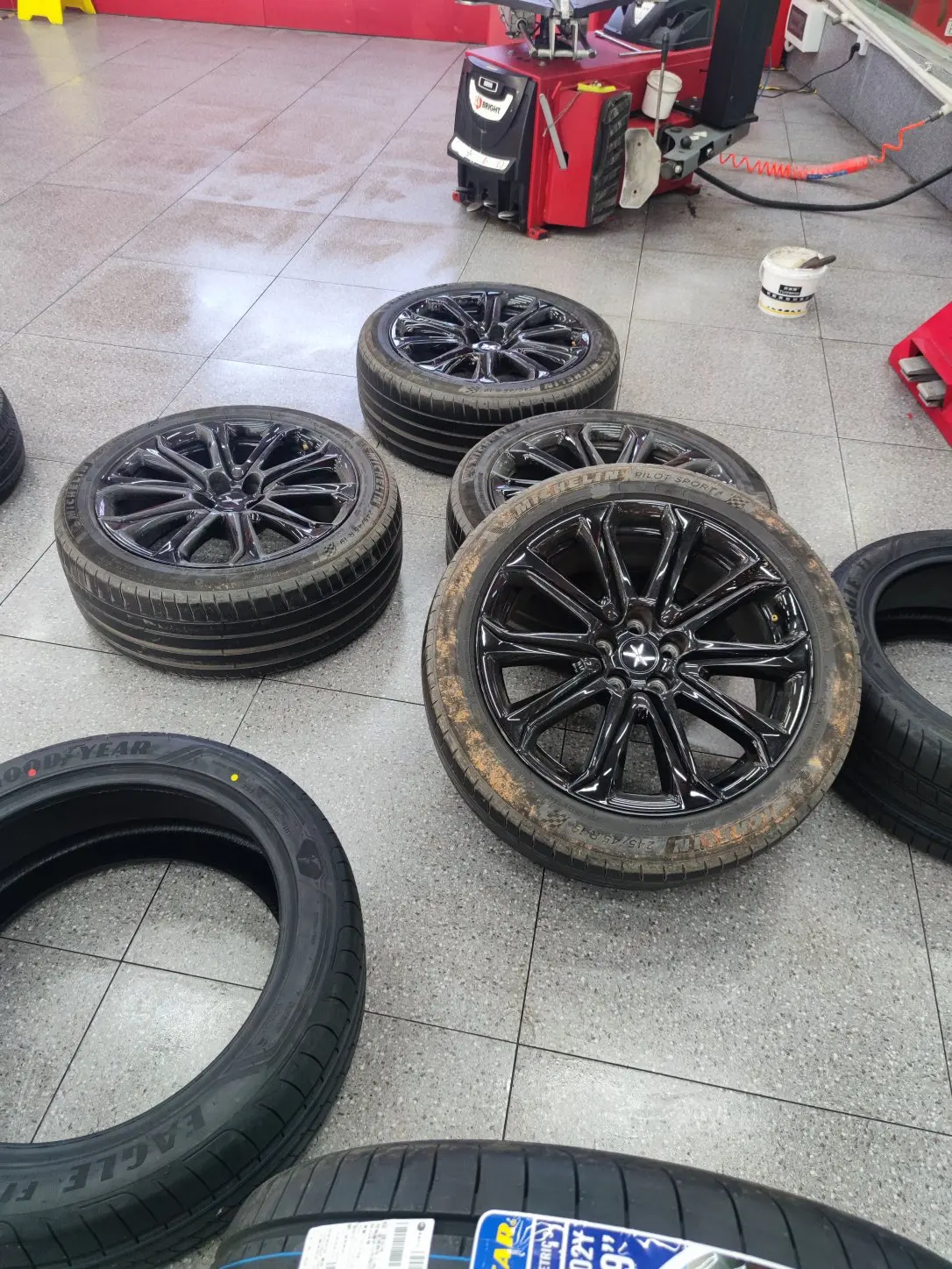提车一年两个月,四万七千公里,四驱虽爽,但是轮胎磨得飞快,这次买了8条轮胎,四条倍耐力255/45R19的PZero,后面查了P7的轮毂数据是19*8J的,最大只支持245的胎宽,然后我又买了4条固特异Eagle F1A3希望会比原厂米其林PS4耐磨一点。最后分享一下关于轮胎的心得,在车胎沟槽变浅以后,轮胎排水性能不如新胎时候的状态了,遇到雨天排水性能不好,滚动阻力就会变得很大,最后直接导致能耗飙升(我跑同一条高速晴天能耗18,雨天能耗24)。
