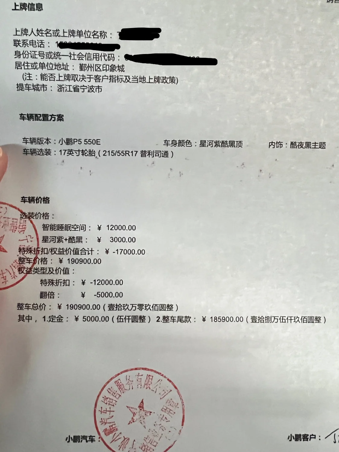 10.27官网上预约了试驾,没多久上海分部的人就电话联系我,耐心给我安排宁波印象城4S店的销售,然后10.30在宁波印象城店第一次真真在在的看到P5实车,销售姜川给我各种讲解,真的是越来越爱,等试驾完,唉呀妈呀,就它了,然后交了5000定金,签了相关协议,初选了紫色外观。(31号改成了白色)就开始了焦急而又漫长的等车之旅。